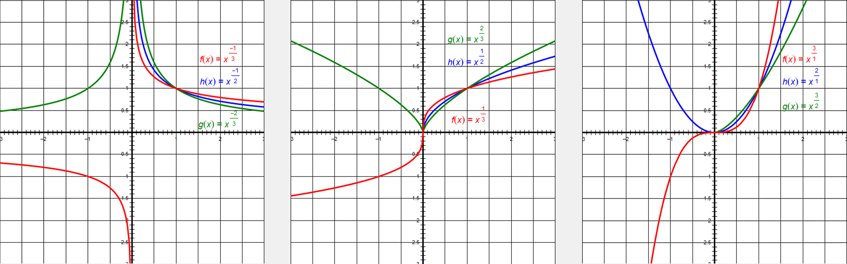 图像特征:\(q\)为偶数时(如\(y=\sqrt{x}\)),图像仅在第一象限,过\((0,0)\)和\((1,1)\);\(q\)为奇数时(如\(y=\sqrt[3]{x^2}\)),图像过\((0,0)\)、\((1,1)\)和\((-1,1)\),关于\(y\)轴对称。